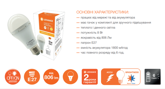 Купуючи акумуляторну світлодіодну лампу Ledvance 8Вт Е27 в інтернет-магазині "Світло", ви можете бути впевнені в якості продукції та швидкої доставки. Ми гарантуємо, що ви отримаєте найкращу ціну на ринку та високий рівень обслуговування. Не відкладайте покупку на потім - зробіть замовлення прямо зараз.